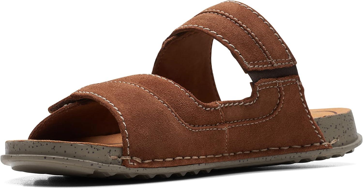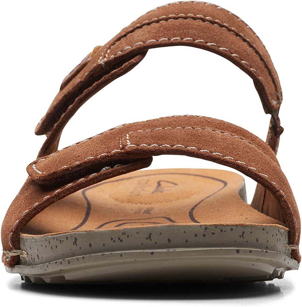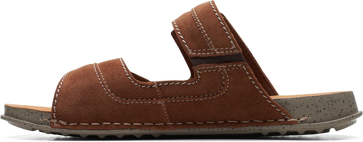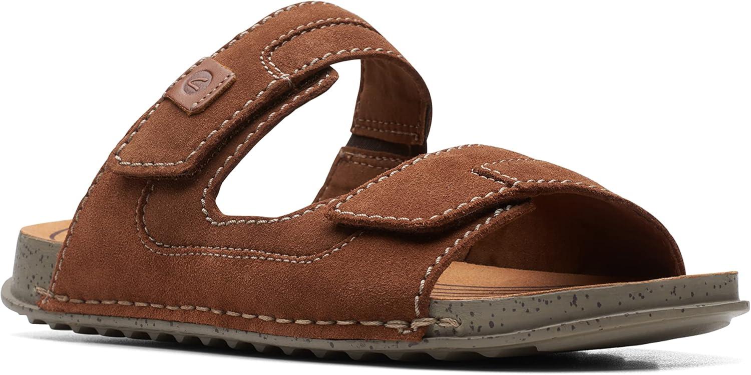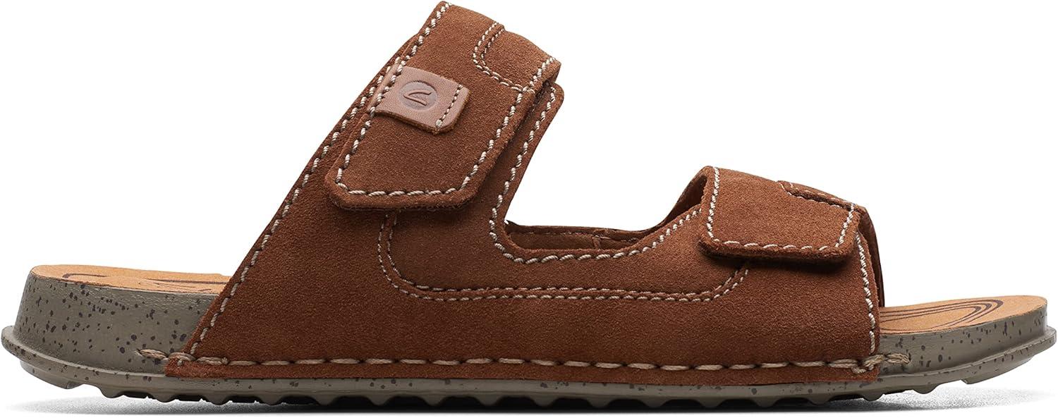A timeless profile, Crestview Easy is a staple lifestyle sandal that melds heritage Clarks design with features for lasting summer comfort. Heavy gauge stitch details and pattern piecing nod to a crafted aesthetic while a breathable OrthoLite® foam footbed, lightweight sole and adjustable strap make for airy, flexible and comfortable movement. – Responsibly sourced black leather upper – Breathable OrthoLite® foam footbed with microfibre sock – Lightweight EVA outsole – Adjustable back strap for a custom, secure fit – Side-stitch construction for increased flexibility