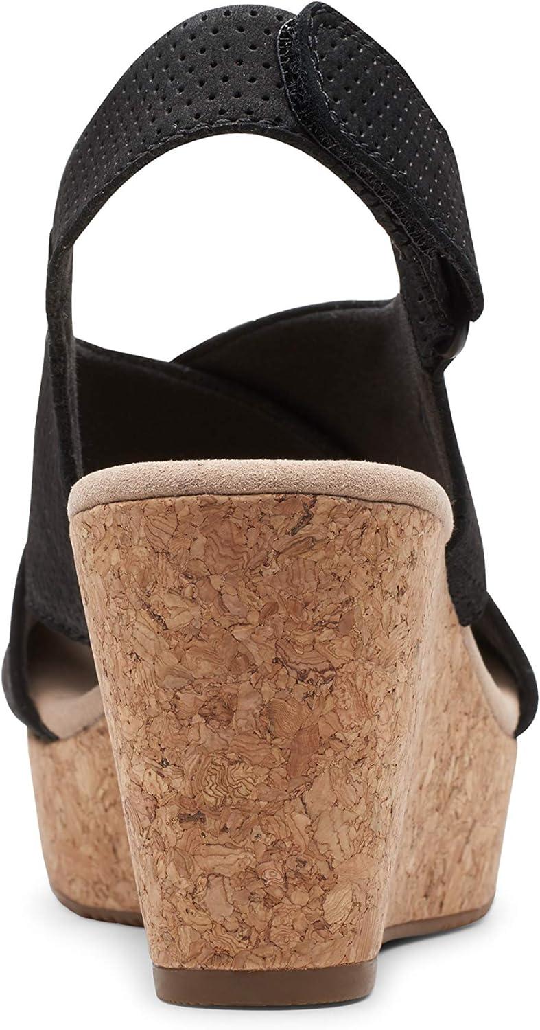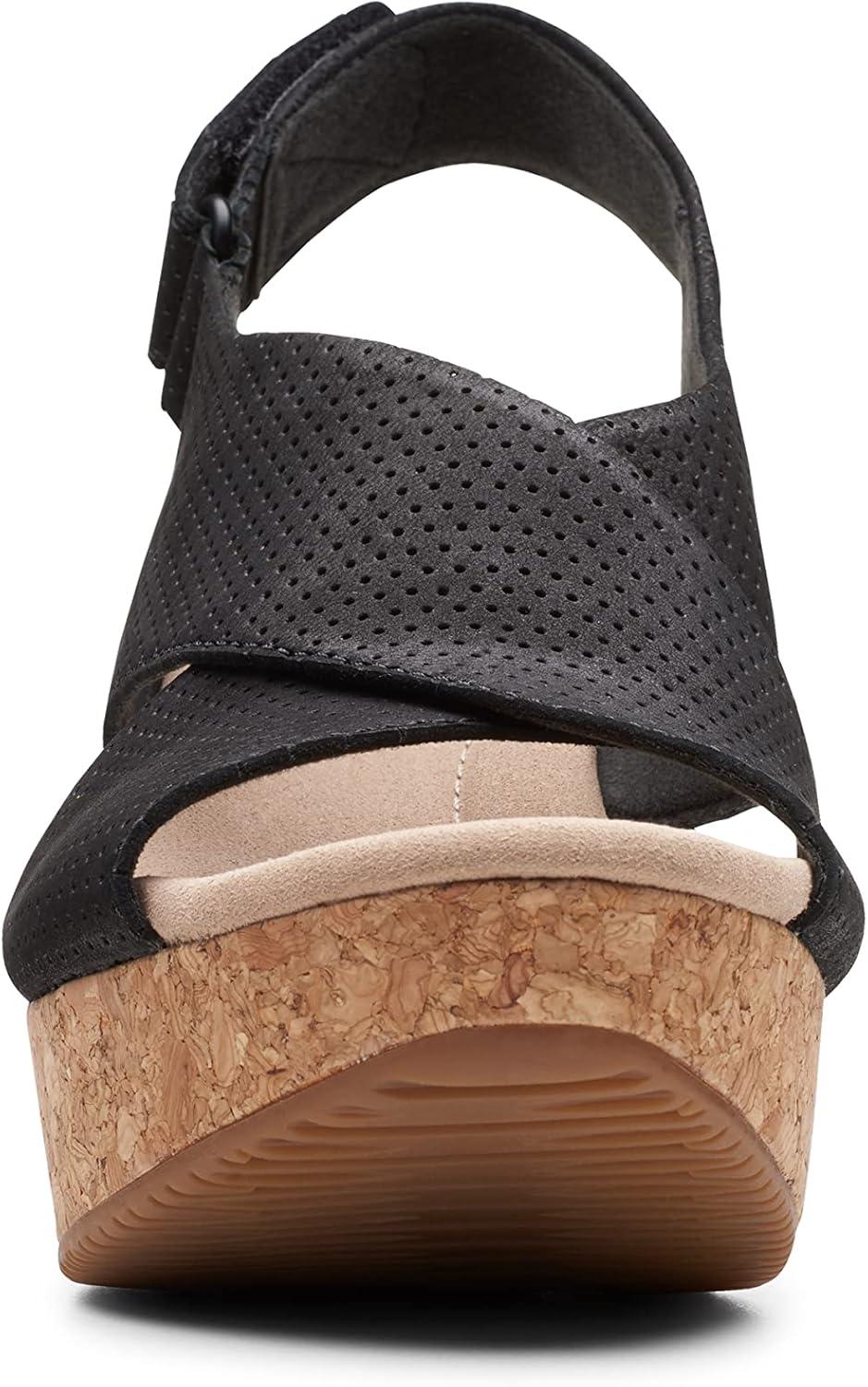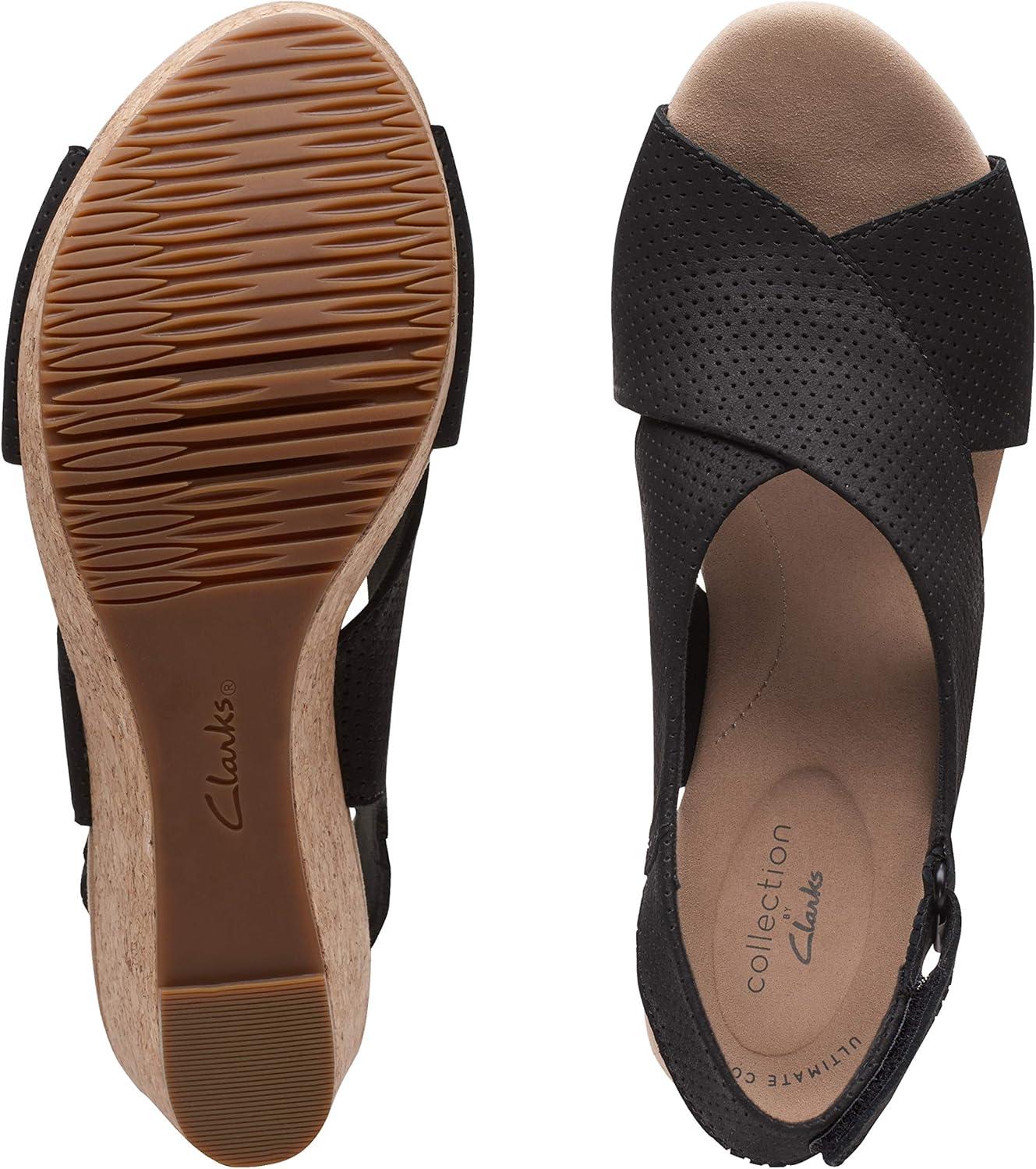 Your staple shoe for spring/summer! the front cross band elongates legs while the adjustable hook and look closure wraps the back of your foot. these are flattering sandals for everyone. these wedges have some platform built into the height and come with clarks comfort soft technology. so they are comfortable and beautiful Your staple shoe for spring/summer. the front cross band elongates legs while the adjustable hook and look closure wraps the back of your foot. Your staple shoe for spring/summer. so they are comfortable and beautiful.