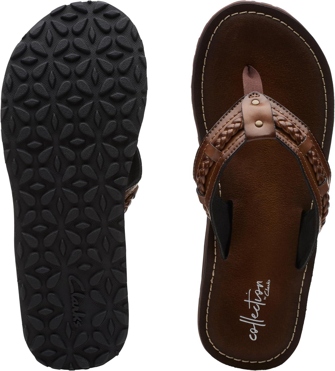 A carefree summer flip-flop with clarks collection aesthetics and comfort. made with honey synthetic straps with hardware accents, it pampers the foot with soft textile linings, a burnished eva footbed with cushion soft layers, and a tpr traction outsole. looks great with jeans, shorts or swimwear.